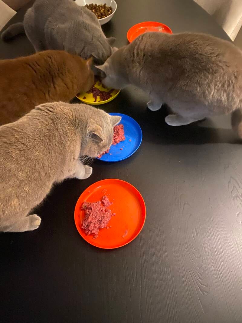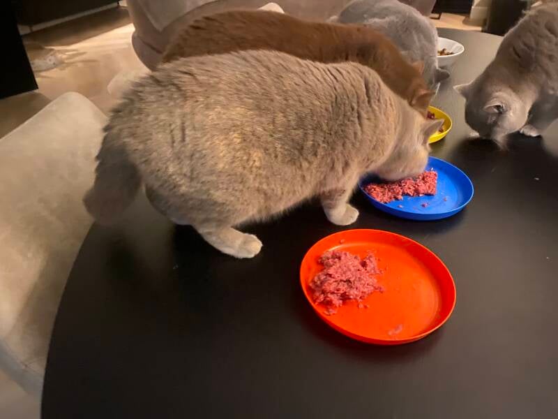 Het ontbijt. Er is hier altijd keuze uit meerdere smaken zo eten Loïs, Koko en Pride het liefst Catmeat Rund, Mona, Peach, Kira en heel soms Bella Babypack en Peach eet ook graag Carnibest Lam samen met Pride, Bibi rund of natuur door Lola en ook wel door Loïs en Mona. Dus de keuze is reuze ook zullen de kittens hiermee opgroeien uiteraard eerst een papje pas als de darmpjes aan vast voedsel zijn gewent vers vlees.