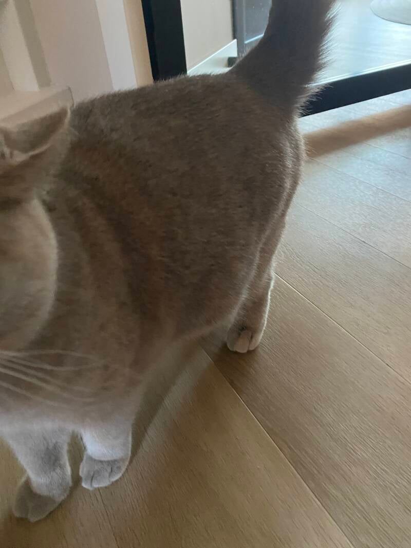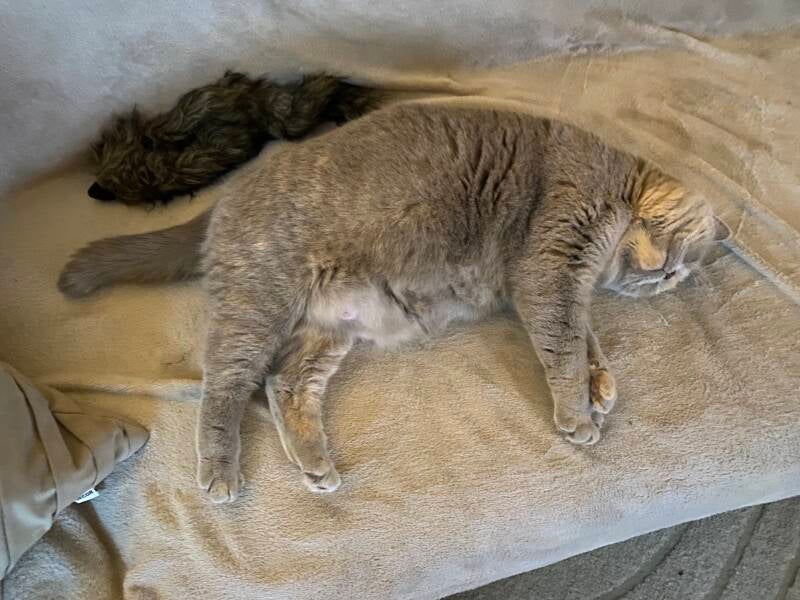 Peach is nog steeds rustig ligt veel boven op bed maar komt ook regelmatig even naar beneden. De camera staat boven aan zodat we haar overdag goed in de gaten kunnen houden. In de nacht ligt ze voornamelijk op ons voeteind van het bed als ze daar niet ligt, ligt ze in één van de 3 beval plekjes die we gecreëerd hebben. De dekens worden omgewoeld waarna een voor haar fijn plekje wordt gecreëerd. Dit gebeurt al een paar dagen. We waken in de nacht en kijken regelmatig hoe het met haar gaat. Op de foto hieronder haar buikje, behalve dat ze zich niet goed meer kan poetsen heeft ze er verder weinig last van. Het blijft voor ons natuurlijk wel spannend, wanneer zal ze bevallen? Woensdag 12 februari is het dag 65 gerekend vanaf de eerste dekking.
